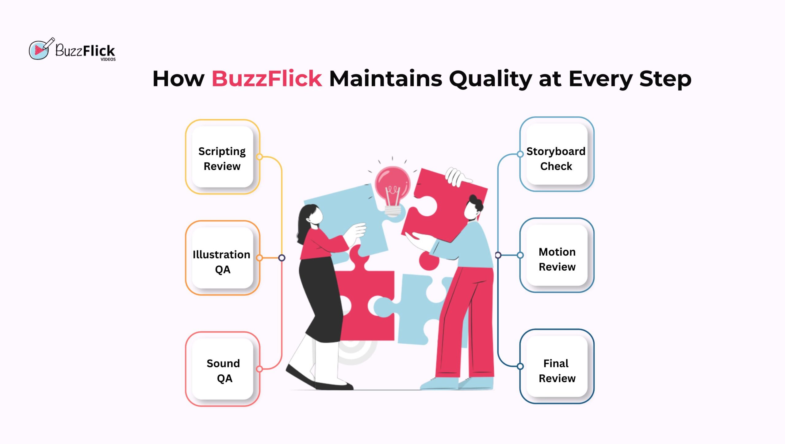 BuzzFlick works with a QA loop that includes internal reviews, test renders, and multiple checkpoints. Each phase includes feedback opportunities.