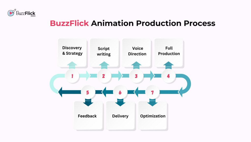 Animation projects can often feel chaotic when there’s no clear process. BuzzFlick Animation solves that by giving you a transparent, guided experience from start to finish. Here’s a breakdown of the standard production workflow: